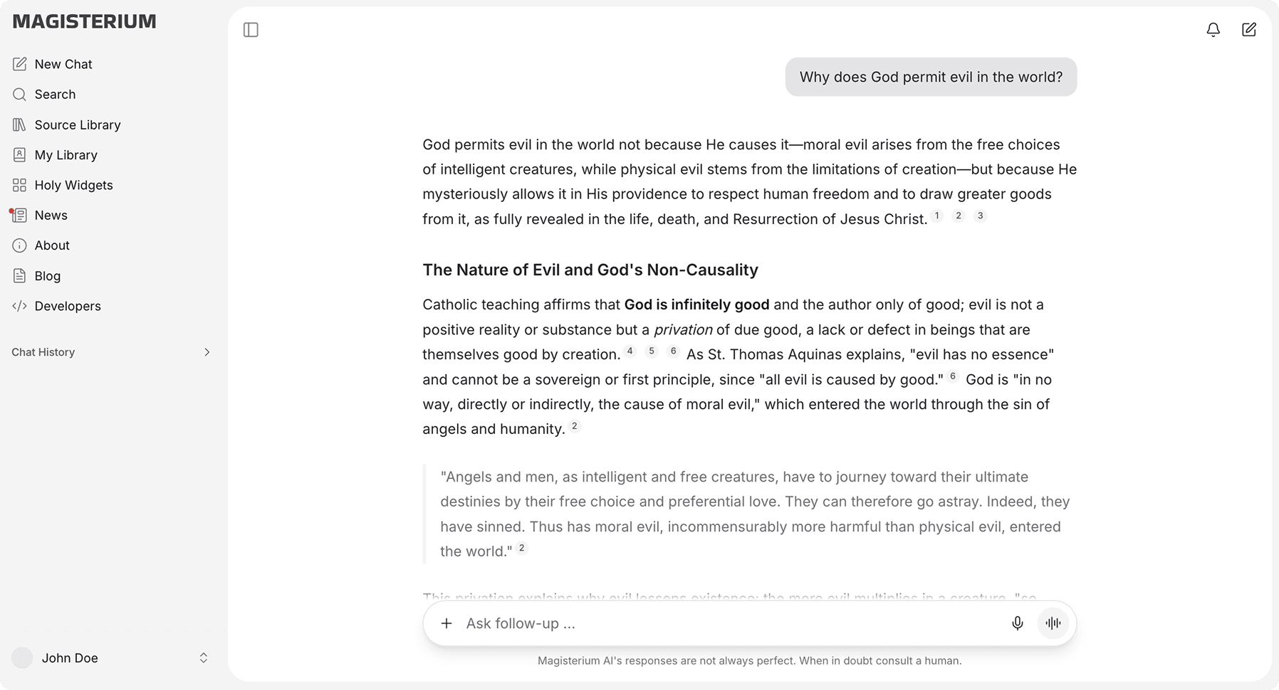Cerchi chiarezza sulla dottrina o sulle Scritture? Magisterium AI attinge al più grande database mondiale di documenti della Chiesa, utilizzando strumenti avanzati per fornire le risposte più accurate, complete e fedeli possibili.