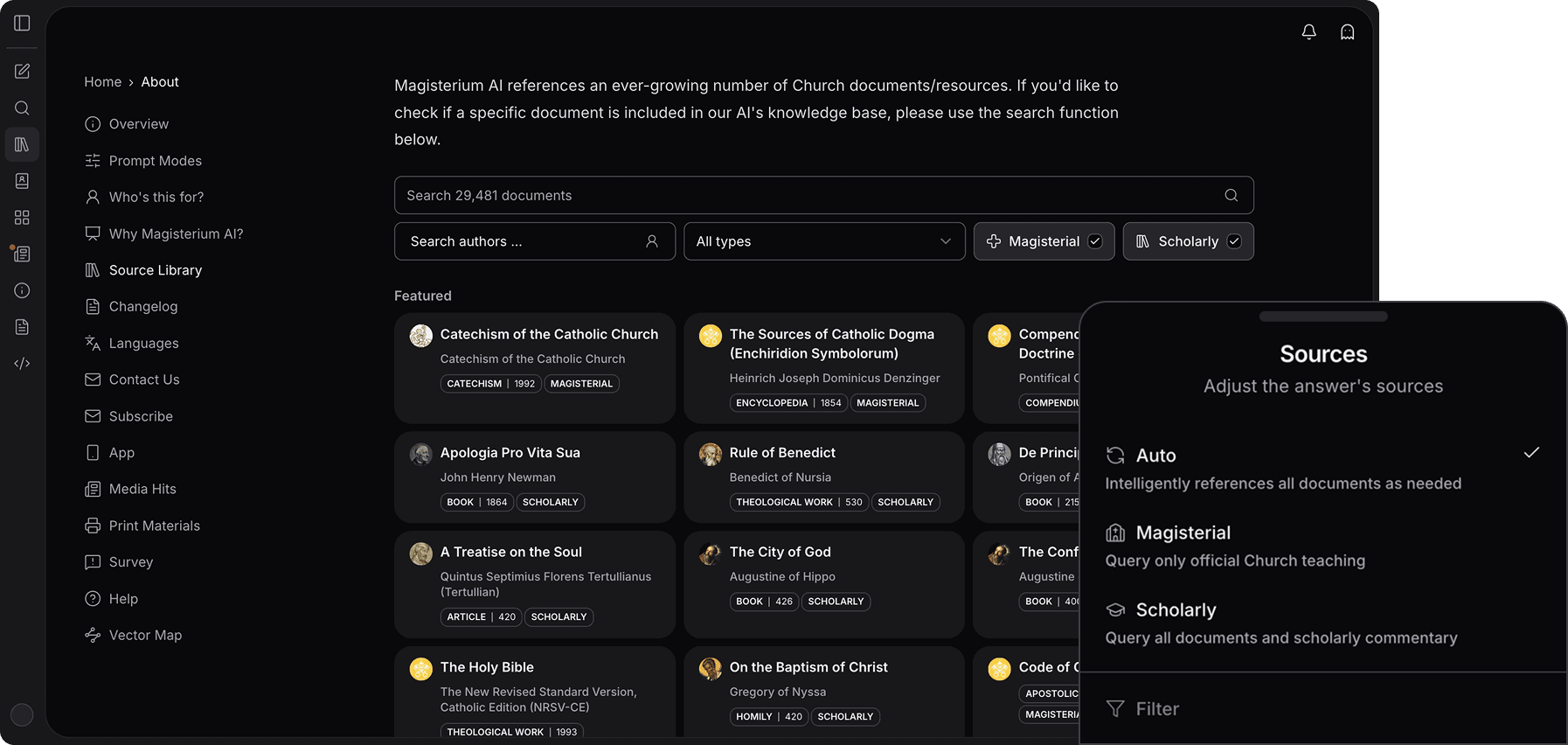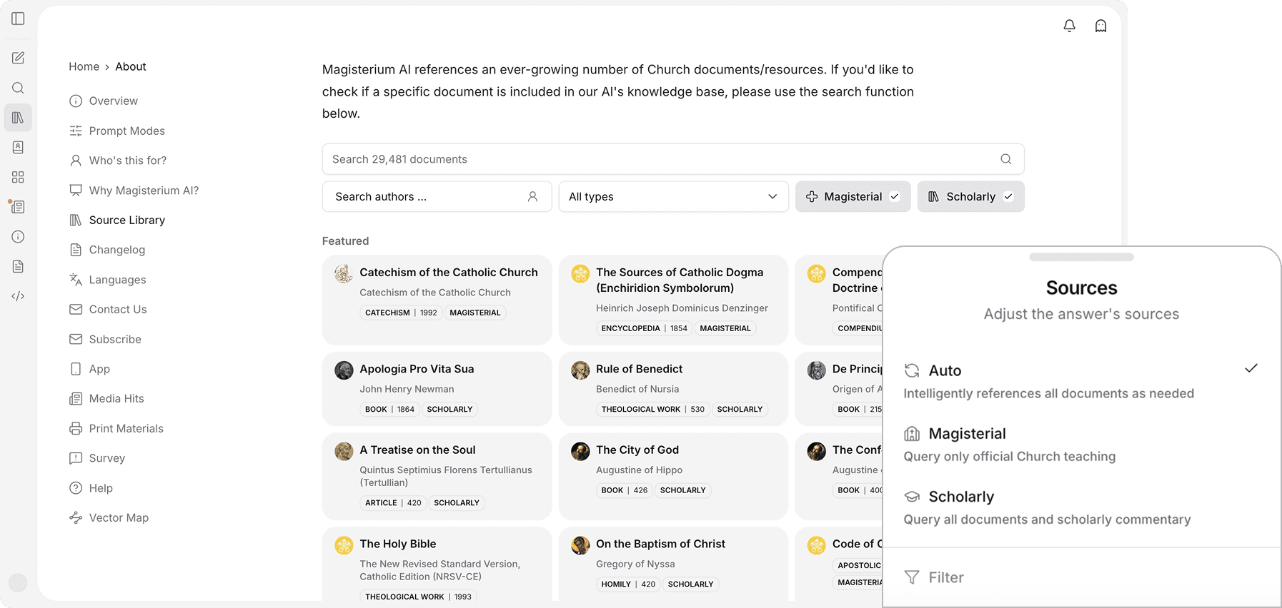 Seeking clarity on doctrine or scripture? Magisterium AI taps into the world's largest database of Church documents, utilizing advanced tools to deliver the most accurate, thorough, and faithful responses possible.
