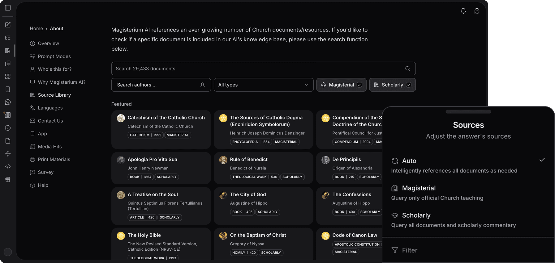 Seeking clarity on doctrine or scripture? Magisterium AI taps into the world's largest database of Church documents, utilizing advanced tools to deliver the most accurate, thorough, and faithful responses possible.